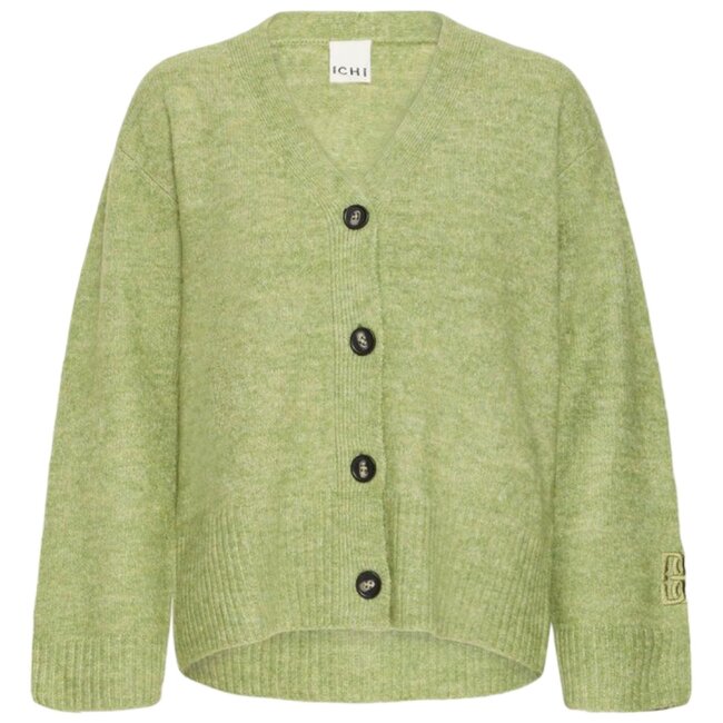 Dit groene vest van ICHI heeft een borduursel op de linkermouw. Het vest heeft een v-hals en donkere knopen. De mouwen van het vest vallen wijd.