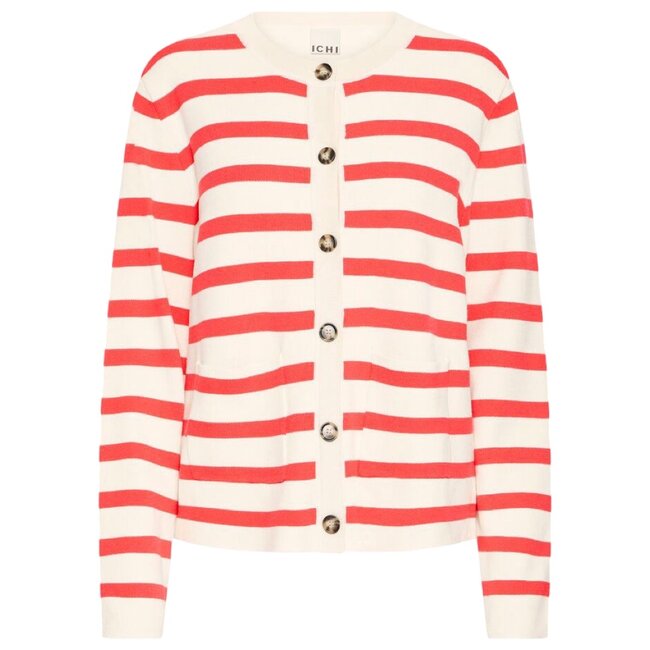 Dit koraal gestreepte vest is van het merk ICHI. Op de voorkant van het vest zijn twee zakken gestikt.