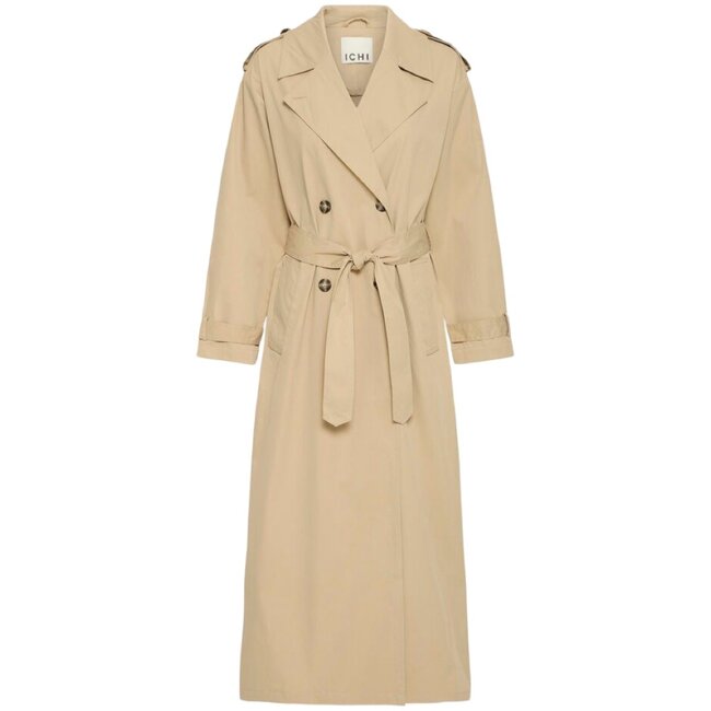 Deze trenchcoat jas is van het merk ICHI. De jas is een heel lang model met aan de achterkant een split. De jas is double-breasted en heeft een koord in de taille.