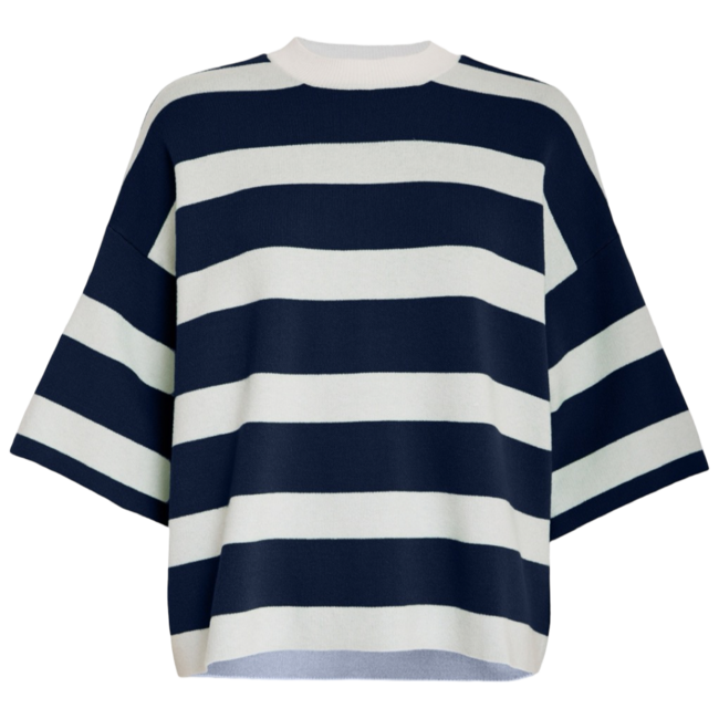 Losvallende gestreepte trui van het merk Minus. De trui is donkerblauw met wit gestreept en heeft een ronde hals.Materiaal: 52% LENZING™ ECOVERO™ Viscose, 28% Polyester, 20% NylonPasvorm: Valt normaal op maat