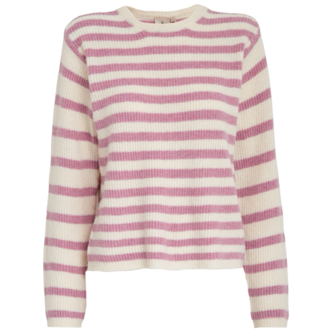 De roze met ecru gestreepte trui is van het merk Peppercorn. De trui heeft een ronde hals.